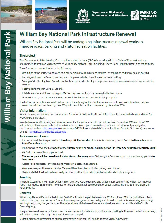The Department of Biodiversity, Conservation and Attractions (DBCA) is working with the Shire of Denmark and key stakeholders to improve visitor access to William Bay National Park; including Greens Pool, Elephant Rocks and Madfish Bay. Refer to the below fact sheet on the upgrades, including closures.