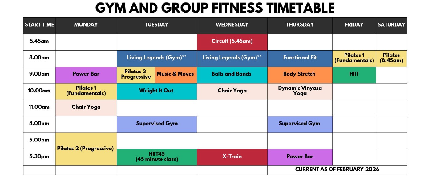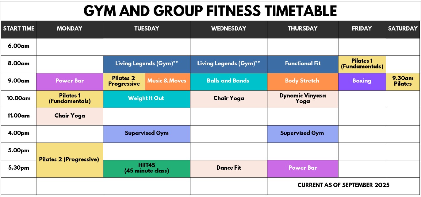 Our gym has a range of functional equipment, machine and free weights, cardio equipment and floor space for patrons. We also offer a range of group fitness session for various ages and fitness abilities.