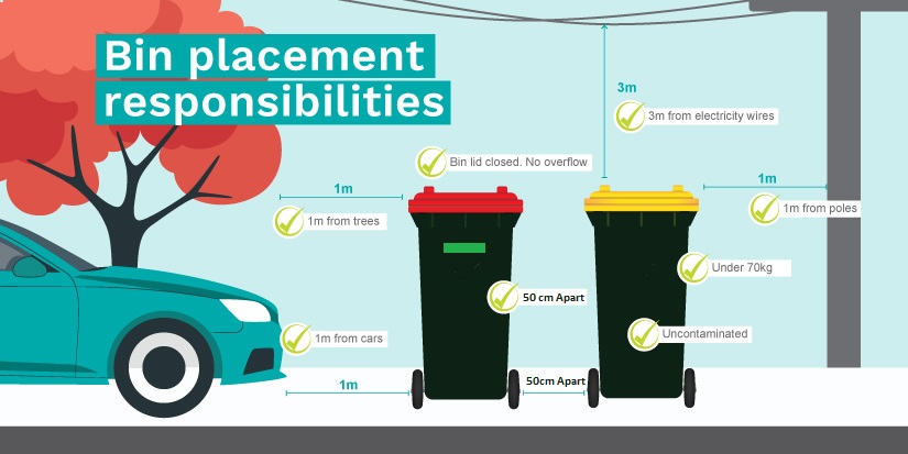 All bins must be placed on the road verge by 6am on the morning of your scheduled pickup. To assist our Waste Services team, the image below outlines the responsibilities of homeowners when placing their bins out for collection.
